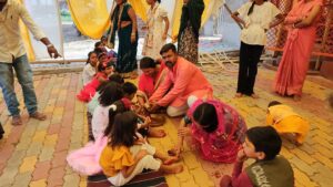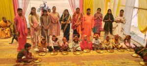 कन्या पूजन में 3 वर्ष से लेकर 5 वर्ष तक की छोटी-छोटी माही,अंजना,प्रीति,मिष्टी,काव्या,अनन्या, तान्या,पीहू,रौशनी,आराध्या व सलोनी बालिकाओं के पैर धोया गया,फिर लाल रंग के आलता से उनके पैरों को रंगा गया,हाथों में चूड़ियां पहनाई,सर पर लाल चुनरी रखी एवं खीर-पूरी खिलाया गया।