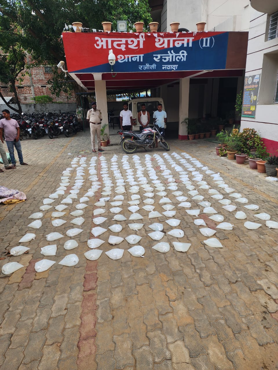 रजौली थाने की पुलिस ने गुप्त सूचना के आधार पर कार्रवाई करते हुए शुक्रवार को फरकाबुजुर्ग पंचायत के कानगो बिगहा गांव के पास से भारी मात्रा में अवैध देसी शराब और एक चोरी की मोटरसाइकिल के साथ तीन व्यक्तियों को गिरफ्तार किया है।बरामद शराब की कुल मात्रा 350 लीटर बताई जा रही है।थानाध्यक्ष सह इंस्पेक्टर राजेश कुमार ने बताया कि सूचक के द्वारा जानकारी दी गई की भारी मात्रा में शराब की खेप तस्करी के लिए लेकर जाया जा रहा है।सूचना मिलते ही थाने में पदस्थापित एएसआई अमीत कुमार,सत्यदेव प्रसाद एवं संजय कुमार के साथ डीएपी पुलिस बलों की टीम को स्थल पर भेजा गया।पुलिस टीम ने कानगो विगहा गांव समीप घेराबंदी कर चोरी की एक बाइक के साथ 350 लीटर शराब के साथ तीन लोगों को गिरफ्तार किया कर लिया गया है।गिरफ्तार किए गए आरोपियों की पहचान रजौली थाना क्षेत्र के फरका बुजुर्ग पंचायत के मोहकामा गांव निवासी भुवनेश्वर प्रसाद के पुत्र सोनू कुमार,पहवाचक गांव निवासी बाबूलाल यादव के पुत्र सुबोध प्रसाद यादव एवं स्व. मोहन प्रसाद के पुत्र नीतीश कुमार के रूप में हुई है।थानाध्यक्ष ने बताया कि उन्हें अवैध शराब के कारोबार से संबंधित विश्वसनीय जानकारी मिली थी,जिसके आधार पर यह छापामारी की गई।मद्दनिषेध अधिनियम के तहत आगे की कानूनी कार्रवाई की जा रही है।गिरफ्तार व्यक्तियों से पूछताछ के बाद शनिवार को जेल भेज दिया जाएगा।इस गिरफ्तारी से क्षेत्र में अवैध शराब के खिलाफ पुलिस की कार्रवाई से कारोबारियों खौफ व्याप्त हो गया है।